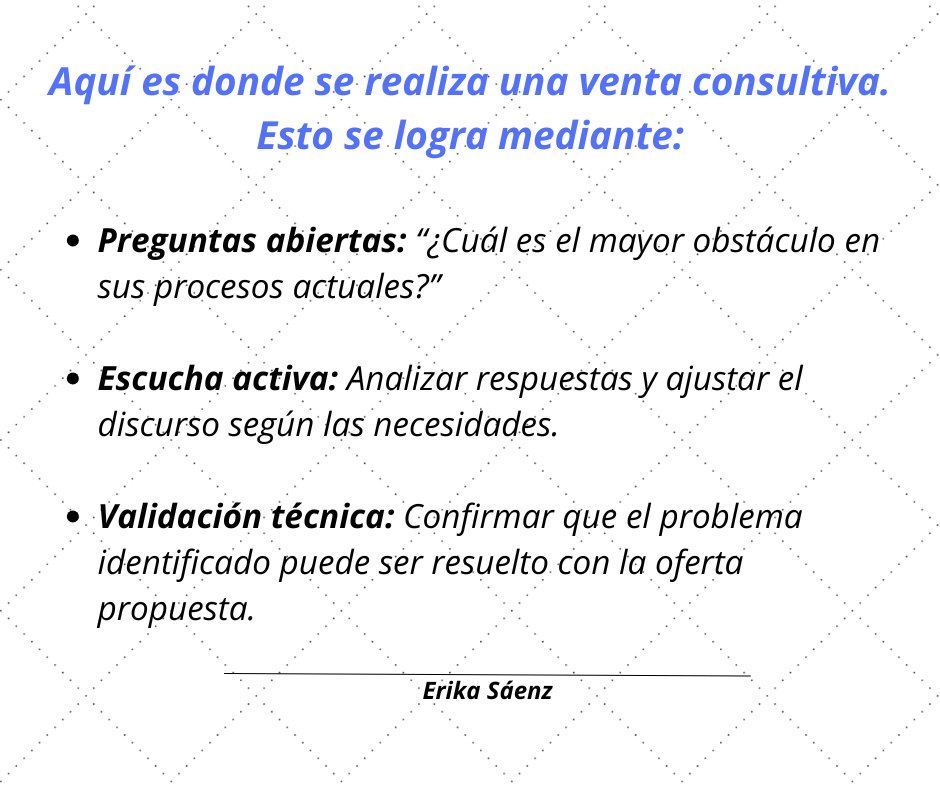 En lugar de iniciar la conversación con un enfoque orientado al producto, es vital adoptar una actitud consultiva, haciendo preguntas abiertas y permitiendo que el cliente comparta sus desafíos específicos. Este enfoque no solo ayuda a identificar problemas que el cliente podría no haber verbalizado, sino que también posiciona al comercial como un asesor confiable.